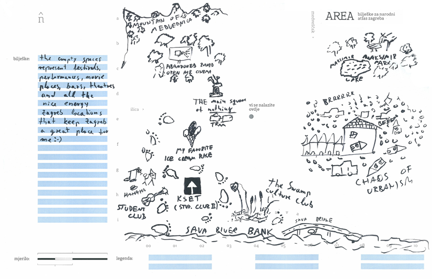 - Notes: The first attempt to adapt NPA outside Chicago, the Zagreb efforts occurred at the invitation of BLOK, the organizers of “Urban Festival” annual public art convergence. Because it was our first experiment, Dave Pabellon and Daniel Tucker acted as the map makers more than in future NPA efforts, working under the name “The Speculators” as an attempt to reflect the research process conducted by outsiders looking in. The initial map was designed to be blank with no outline of the political boundaries of the city limits because our hosts suggested that no Zagrebians would recognize their city that way and they encouraged us simply to indicate the rough shape of the river and the location of the city center. The process unfolded over one week where informational walking tours on ecology, urban planning, art, and political history were led by local residents. The Speculators also went on drifts throughout the city, talking with random residents at markets about the travel routes of their goods, led map-making workshops with a student group, interviewed urban planners about the legacy of socialist state planning on the current urban design and solicited numerous thematic maps from residents around the local academic and arts communities. The results were compiled over the course of the week into a “critical tourist” guide to zagreb which was printed and distributed locally at the university and tourism offices. A lecture on mapping and the work of AREA Chicago was held at upon the completition of the visit at Booksa, a leftist bookstore and cafe where a window display of the blank map of Zagreb was presented in the store-front that invited passer-bys to record important local cultural spaces and historical events by drawing directly on the window pane.